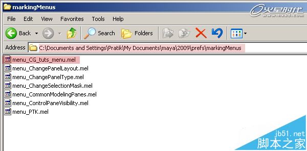 第13步、如果你想在另一臺機器上使用這個標記菜單,你可以將生成的標記菜單文件復制到另一臺機器上,標記菜單文件夾默認路徑是:C:/Documents and Settings/用戶名/My Documents/maya/2009/prefs/markingMenus