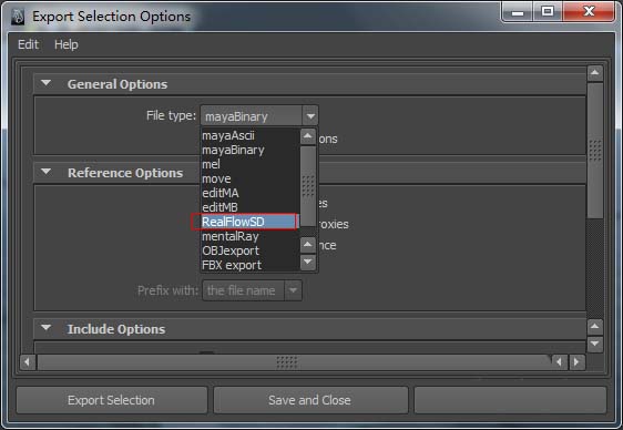 4、在File type下選擇ReaFlowSD,(當然前提是你安裝好了reaflow的接口,并且在maya的插件里選擇有reaflow的插件),保存在一個地方。