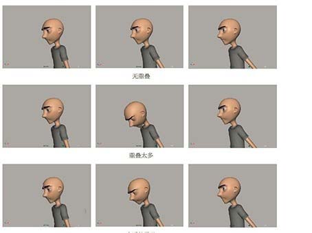 4、在一個張望動作中,頭頂和下巴的時間與空間幅度并不完全相同,這個道理適用于身體各個部位。但是重疊動作到底加多大,不同的時間有多少只能靠動畫師的經驗來判斷,重疊太多會失真,太少會僵硬。所以,如果我們只知道預備動作,那我們可能會把頭往回拉再往前看;如果我們只知道弧線運動,那可能會在看的過程中畫一個弧線;但如果我們不知道重疊動作,那可能就不會想到,在過渡的時候要旋轉一下,讓頭頂先動。