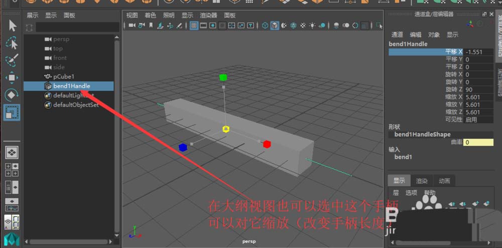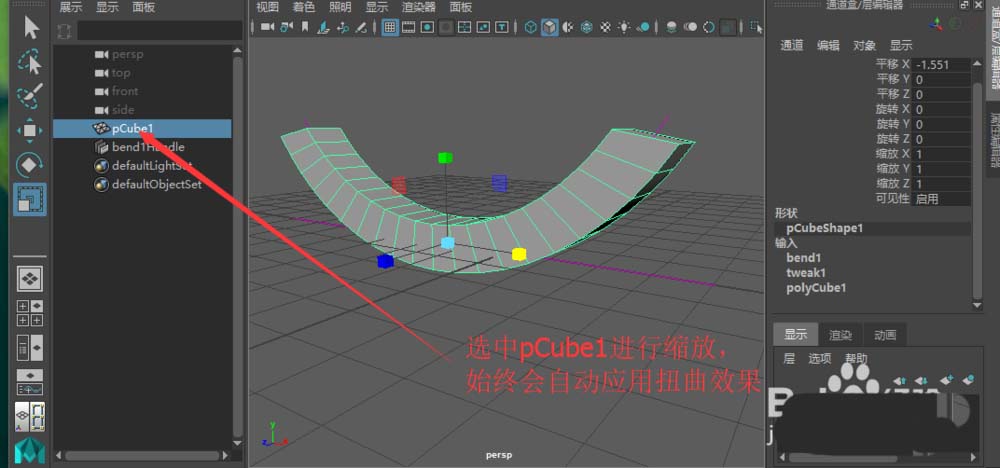 6、如果我們選中pCube1進行縮放,我們看到,彎曲效果被實時的應用了。