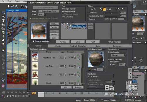 地面上的小草和花朵,以及遠處的樹木,我使用的是生態系統材質。因為筆刷繪制植物的方式,除了可大量散布,同時還能加速畫面的渲染。近處的樹木,在默認形態的基礎上進行一些樹干粗細和枝葉散布的調節,并最后提高樹木的多邊形數量為原來的4倍(達到5萬面以上)。