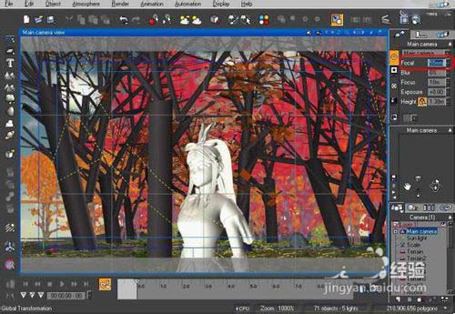 調節攝像機焦距為55mm,接近人眼的觀察效果,并保存好所需的鏡頭。Vue中保存攝像機的方式有點像maya的攝像機標簽功能,它并不會增加新的攝像機;雖然在Vue中可看到多個攝像機圖標,但是在通過Vue對maya的接口導入maya場景時,只會得到Vue文件最后一次保存時所選擇的攝像機。