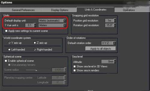 使用Vue制作自然環境,需要注意的是Vue的默認單位是米,Maya的默認單位是厘米,因此應該在創建場景前進行縮放比例的匹配。因為我在Maya中創建的模型是“模型:實物=1:10”,因此Vue軟件的設置如下:File->Options->Units&Coordinates->Units->1 Vue unit is:0.1。
