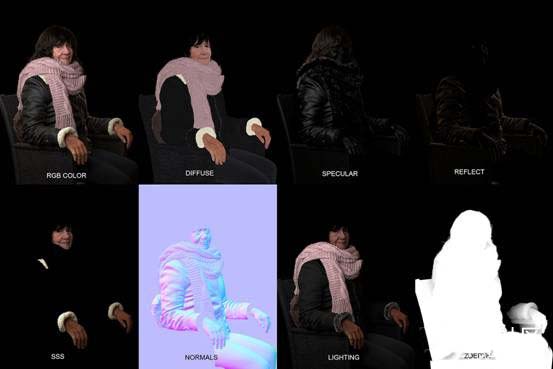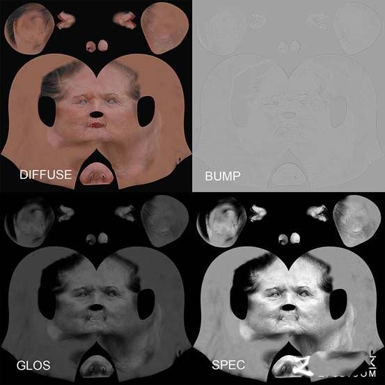 對于紋理的臉,我使用的照片,我事先拍的,我通常采取360度的照片,我的科目,沒有直接的光,沒有硬陰影。我把這些照片放在模型的Mudbox,然后手繪了皺紋,熱點,和陰影。使用平面照明是Mudbox的一個很好的功能,使繪畫更準確; 你可以看到什么紋理貼圖正在做沒有分心的著色器。
