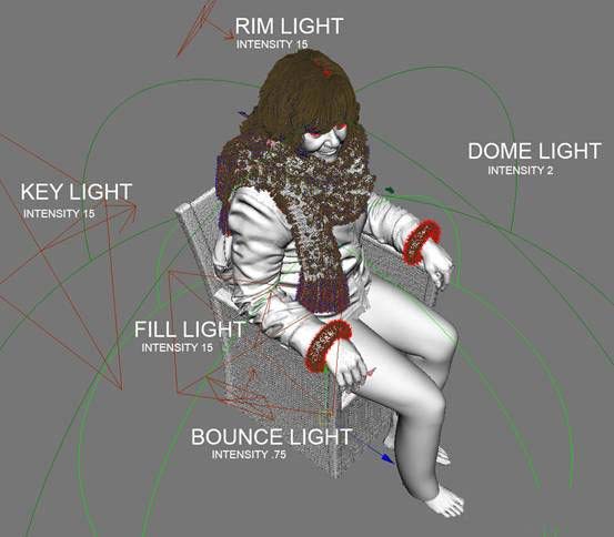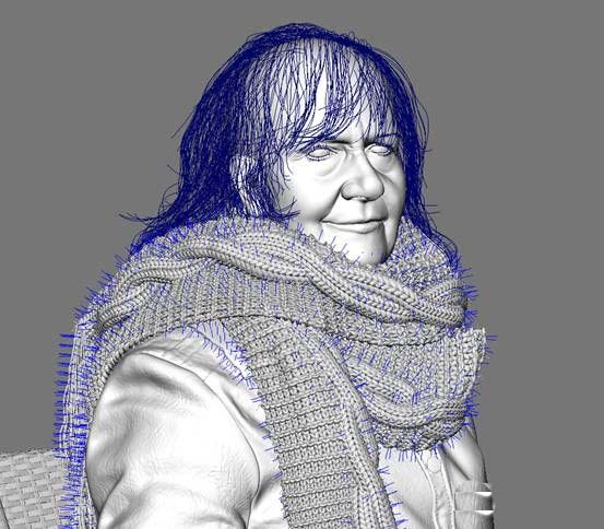 我通過使多邊形平面匹配照片參考創建了頭發。我將飛機轉換成NURBS曲線,然后添加了nHair和V-Ray頭發材料。 頭發看起來最真實,,當它有一個隨機性,所以我試圖有部分頭發聚集在一起,也是單隨機頭發。 我試圖在整個有一個小的顏色變化,因為重要的是不要讓頭發看起來平。對于這件作品我也使用頭發的睫毛,圍巾,衣領和袖口。