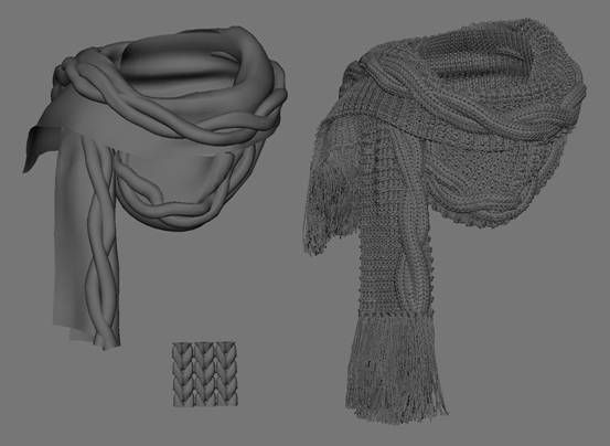 這幅肖像的圍巾是非常耗時。我嘗試使用模具和雕刻的細節編織,但沒有得到我想要的結果,所以我決定把它模型化。 我創建了一種可以復制到任何尺寸我需要的花木織物圖案,然后我做了兩個版本的圍巾:1)圍繞脖子和2)平面。