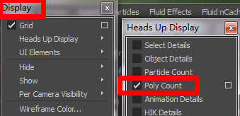 4、設置工作區的信息顯示。比如打開多邊形元素信息統計的顯示,點擊展開display-Heads Up Display,勾選上:poly count項。