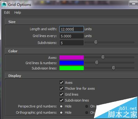 3、比如,現在繼續設置一下maya界面中的這個網格的顯示色彩、大小、網格線條數量等等。打開:display->grid options選項。然后可以設置色彩了。