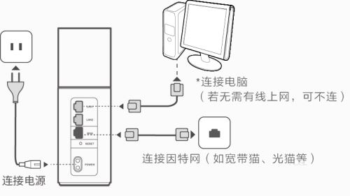 連接線纜:用網線將路由器的藍色網口(WAN 口)連接到因特網(如寬帶貓、光貓等),連接電源。