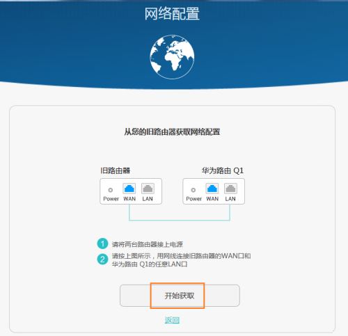 根據界面提示,用網線將舊路由器的 WAN 接口連接到華為路由 Q1 的 LAN 接口,點擊“開始獲取”即可。