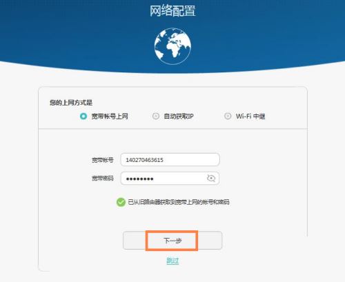 3) 跟隨向導指引(以寬帶賬號上網PPPoE為例),輸入寬帶上網賬號和密碼,點擊“下一步”。