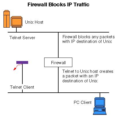 現在我們“命令”(用專業術語來說就是配制)防火墻把所有發給UNIX計算機的數據包都給拒了,完成這項工作以后,“心腸”比較好的防火墻還會通知客戶程序一聲呢!既然發向目標的IP數據沒法轉發,那么只有和UNIX計算機同在一個網段的用戶才能訪問UNIX計算機了。