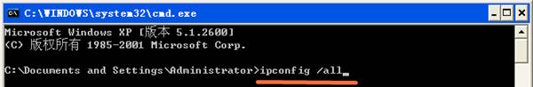 2、在彈出的命令提示符窗口中輸入“ipconfig /all”并回車。(注:ipconfig 命令為查看IP配置信息,參數(shù)“all”表示查看所有網(wǎng)卡的全部配置信息)