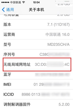 在“設(shè)置 > 通用 > 關(guān)于本機”,我們可以找到“無線局域網(wǎng)地址”,這個就是iPhone手機的MAC地址了。PS:不同iOS版本的名稱不同,有的版本叫做“Wi-Fi地址”。