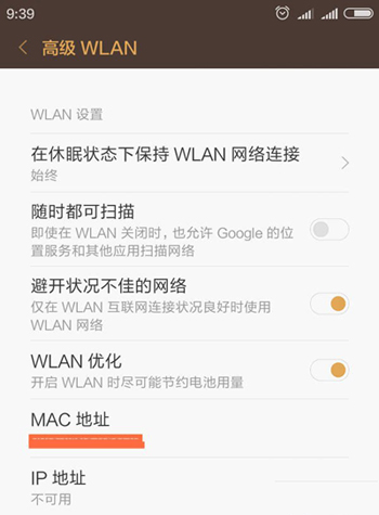 在“設(shè)置 > WLAN設(shè)置 > 高級設(shè)置”里面就可以直接找到Android手機的MAC地址了。(PS:其他安卓手機的查看方法應(yīng)該是大同小異的)