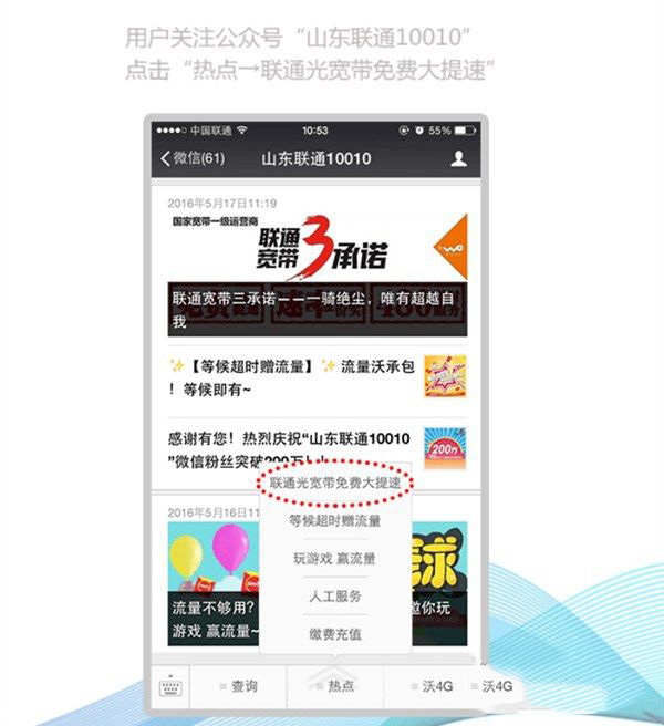 首先關注微信公眾號:山東聯通10010 然后點擊“熱點->聯通光寬帶免費大提速,按照提示完成100M寬帶升級。如圖。