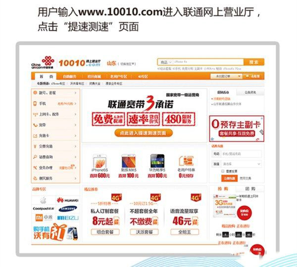 在手機或電腦瀏覽器中,打開中國聯通官網,然后進入聯通網上營業廳,點擊”提速測試“頁面,如果滿足升級要求,即可按照提示完成100M寬帶免費升級,如圖。