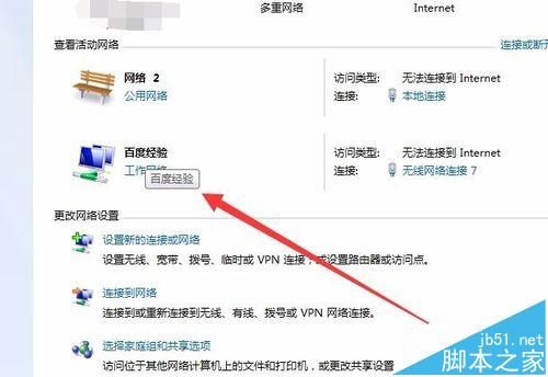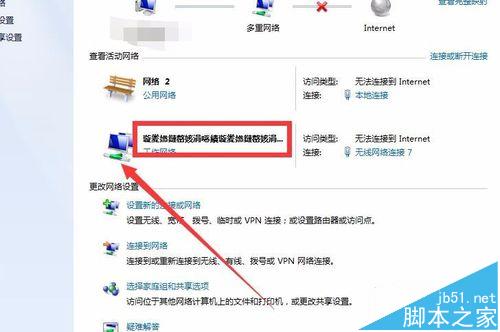 2、進入到【網絡和共享中心】選項的具體界面后,小伙伴們可以看到自己的寬帶名稱確實發生了亂碼的情況,此時我們雙擊下圖箭頭所指處的標識。