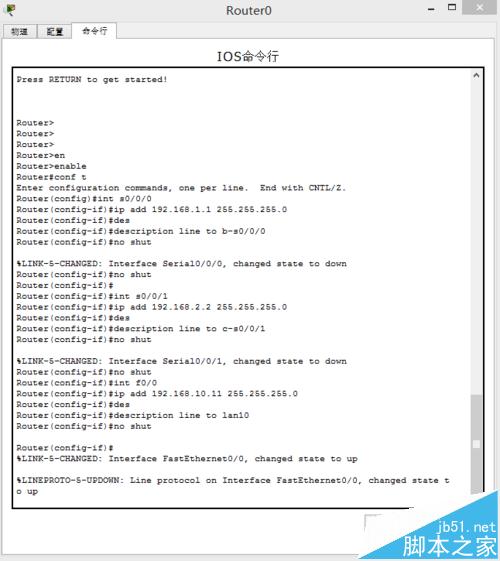 4、進入全局模式,給路由器每個端口配置IP,如給路由器a配置命令為: