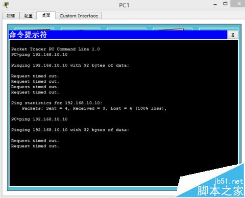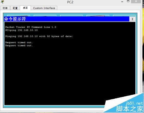 5、待所有的路由器配置好之后,各個設備都亮綠燈,代表你每個設備都正常工作,然后檢查一下電腦之間是否可以通信,如不可以是正常的,因為還沒有進行動態路由rip配置,如下圖所示: