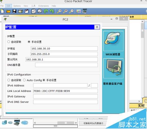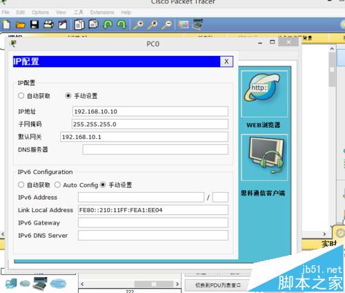2、給電腦配置IP地址,網關,并且要使它們處于不同網段之間,給PC0配置IP地址為:192.168.10.10 255.255.255.0 網關為192.168.10.1,PC1配置IP地址為:192.168.20.10 255.255.255.0 網關為192.168.20.10 給PC2配置IP地址為:192.168.30.10 255.255.255.0 網關為 192.168.30.1,如下圖所示: