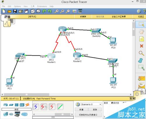 1、首先打開思科模擬器軟件,找到3臺2811類的路由器和3臺交換機,3臺電腦,若干條電纜,進行連接,路由器與路由器之間用DCE串口線連接,電腦和電腦之間用直通線連接,如下圖所示: