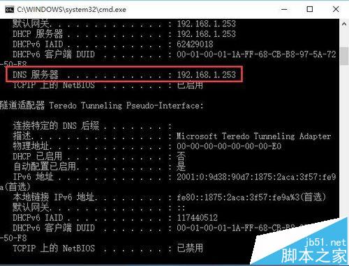 7、然后輸入:ipconfig /all 就能看到現(xiàn)在在使用的DNS服務(wù)器了。