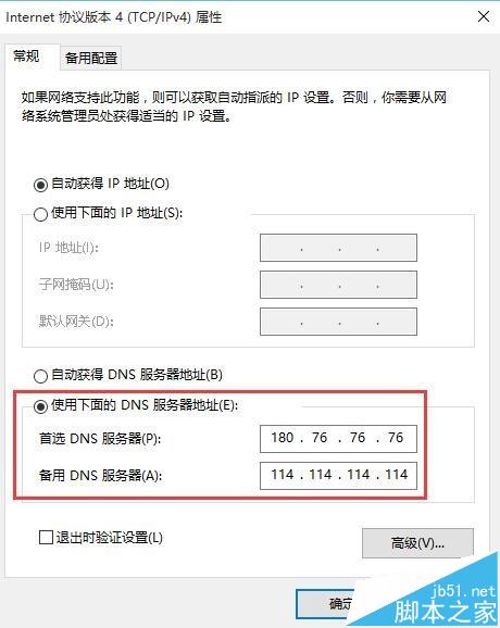 5、然后設(shè)置DNS地址,首選DNS服務(wù)器為:180.76.76.76。 備用DNS服務(wù)器為:114.114.114.114.設(shè)置好之后點(diǎn)擊確定按鈕就可以把電腦的DNS設(shè)置為百度公共DNS了。