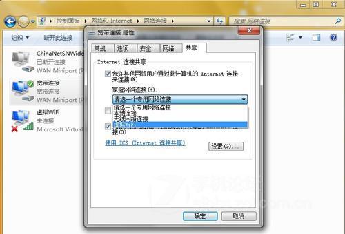 在“網絡連接”窗口中,右鍵單擊已連接到Internet的網絡連接,選擇“屬性”→“共享”,勾上“允許其他······連接(N)”并選擇“虛擬WiFi”。