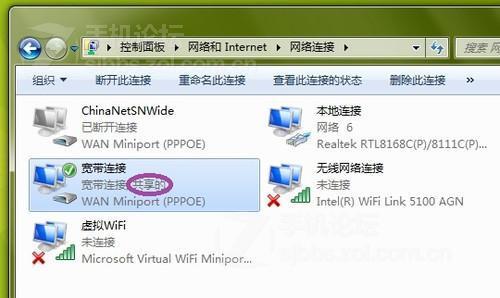 確定之后,提供共享的網卡圖標旁會出現“共享的”字樣,表示“寬帶連接”已共享至“虛擬WiFi”。