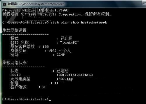 附:顯示無線網絡信息命令:netsh wlan show hostednetwork