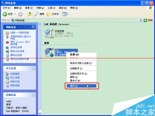 4、鼠標(biāo)右鍵點(diǎn)擊寬帶連接,選擇屬性打開。