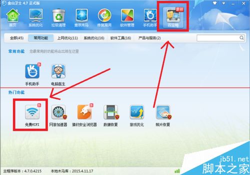 2、進入金山之后我們點擊右上角最后一個功能,“百寶箱”,進入百寶箱之后可以看到很多關于金山的一些功能軟件的推薦。這里我們直接點擊“免費wifi”,如圖所示: