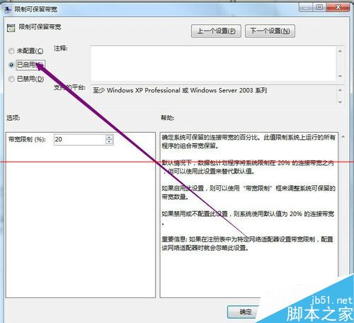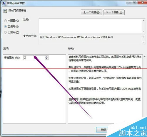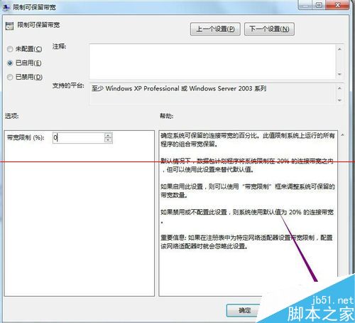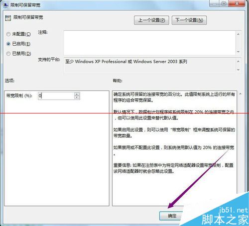 10、在打開的屬性對話框中的“設(shè)置"選項卡中將”限制可保留帶寬“設(shè)置為”已啟用“,然后在下面展開的”帶寬限制(%)“欄將帶寬值”20“設(shè)置為”0“即可
