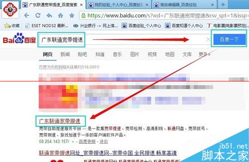 1、用瀏覽器打開百度首頁,使用百度搜索關鍵字“廣東聯通寬帶提速”,點擊第二個搜索結果。