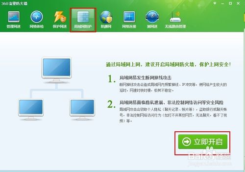 切換到“局域網(wǎng)防護”選項卡,點擊“立即開啟”按鈕。