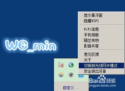 7、在電腦右下角,小度wifi圖標上點擊鼠標右鍵,選擇【切換到無線網(wǎng)卡模式】后,小度wifi就變成了一個無線網(wǎng)卡,可以接收無線路由等設(shè)備釋放的無線網(wǎng)絡(luò)信號來進行上網(wǎng)。