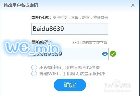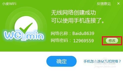 5、創(chuàng)建成功后會顯示成功字樣,還有wifi名稱和密碼。點擊【修改】按鈕,可以對名稱密碼進行修改。