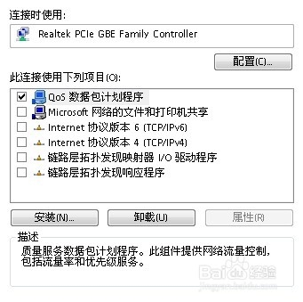 3、出現(xiàn)“網(wǎng)絡(luò)連接”對話框,右鍵點擊“本地連接”,選擇“屬性”,在“網(wǎng)絡(luò)”選項卡下,將“此連接使用下列選項”下面各選項前面的√去掉,只剩下“QoS數(shù)據(jù)包計劃程序”這個選項前面打√。然后“確定”。