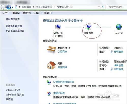 windows7操作系統(tǒng)下,打開“網(wǎng)絡(luò)和共享中心”出現(xiàn)“多重網(wǎng)絡(luò)”標示。