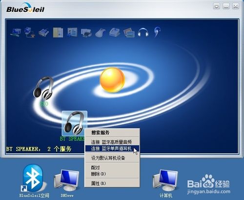 8、這時候,我們再次右鍵單擊這個藍牙設備圖標,再左鍵單擊“連接 藍牙單聲道耳機”,注意注意注意:不是點“配對”,否則你又會碰到“藍牙bluesoleil不能與該設備建立連接,請確認其電源開啟且已設置為可發現模式”;