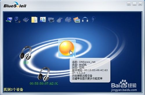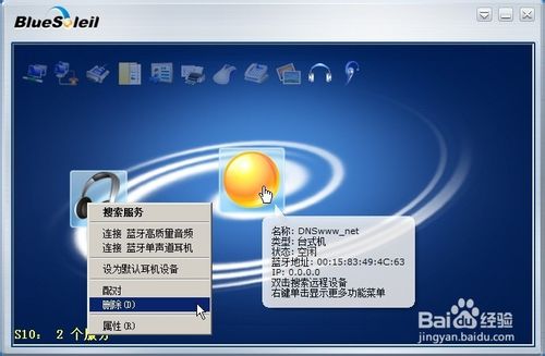 7、簡短的搜索后,右下角出現了“2個服務”,上方圖標出現了“一個頭戴耳機”和“一個藍牙耳機”2個圖標,這個就是這個藍牙設備能提供的2個服務;