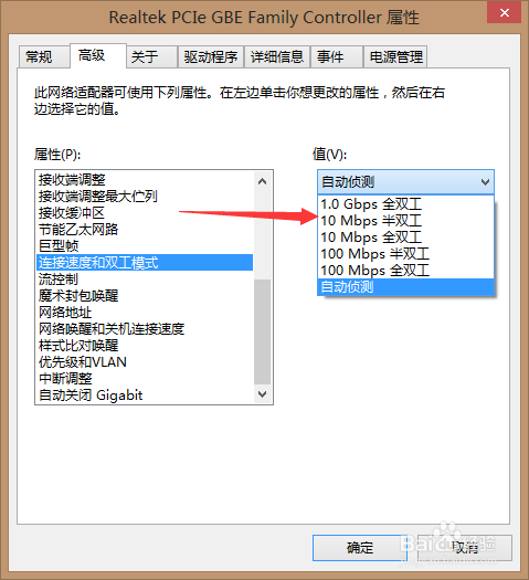 5、選擇高級,在下拉列表中找到連接速度和雙工模式