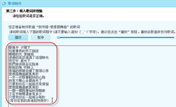 把準(zhǔn)備好的歌詞文本分段粘貼到歌詞框中