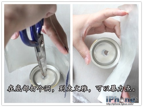 接下來在罐底打個洞,并不要求一定要正圓形,所以可以直接拿大剪刀先捅后轉。這里還要說明一點,大家制作時也可以去掉罐底留下罐口(帶拉環的那側),這樣就不需要打孔了,直接可以將路由天線插在飲口中。不過飲口比露頭天線大許多,所以還需要用雙面膠固定,有利有弊。