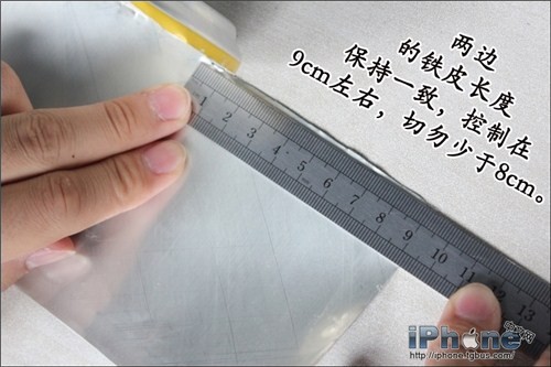 這一步非常關鍵,由于鐵皮具有韌性,所以需要裁剪到適中的長度才能將其舒展開來,并且兩邊的長度必須等長。經過多次測試,小編建議大家將鐵皮長度控制在9厘米左右,切勿少于8厘米,否則鐵皮容易起卷,不容易張開。