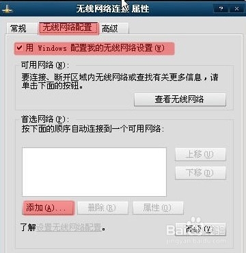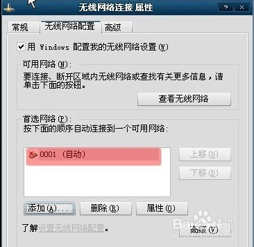 無線網絡配置--勾選“用windows配置我的無線網絡設置--添加--關聯--網絡名填你喜歡的不要中文(如0001)--網絡身份驗證:開放式 --數據加密:已禁用--確定