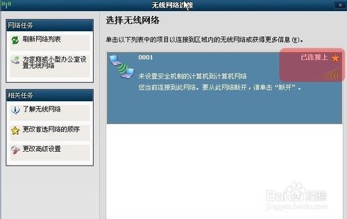 右鍵單擊任務欄無線網卡圖標,單擊“查看可用的無線網絡”--刷新網絡列表(顯示你第五步添加的網絡0001啦,這時如果你附近有其它無線熱點,也會搜索到并顯示啦,綠色標識滴就是我附近的無線網絡)--選中你添加的網絡0001--連接,不要再動了,他在等待你手機連他呢