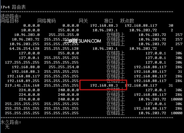 此時運行“route;print”,可以看到默認網關(default;gateway)已經為無線連接的。