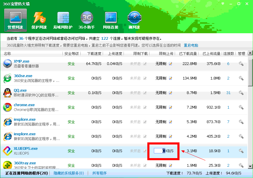 今天發現網速有些慢,原來是一些影視播放軟件偷偷的上傳數據,上傳近200k,導致網頁也打不開,沒想到360竟然自帶這個功能。